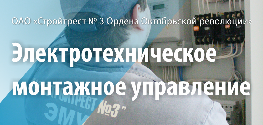 Электротехническое монтажное управление является специализированным филиалом открытого акционерного общества «Стройтрест №3 Ордена Октябрьской революции». Создано 2 марта 2009 года на базе участка электромонтажных работ УМС-108 ОАО «Стройтрест №3 Ордена Октябрьской революции» в целях увеличения объемов подрядных работ предприятия за счет выполнения собственными силами электромонтажных работ, работ по монтажу слаботочных систем, электросилового оборудования, линий электропередач, систем связи, телевидения, видеонаблюдения и радиофикации, систем противопожарной и охранной сигнализации, наружного освещения, а также автоматизации вентиляций и тепла, и других специальных работ.Начальник управления: Архипов Алексей Павлович