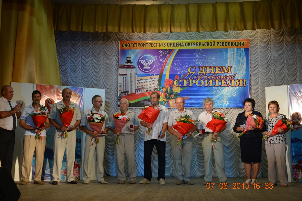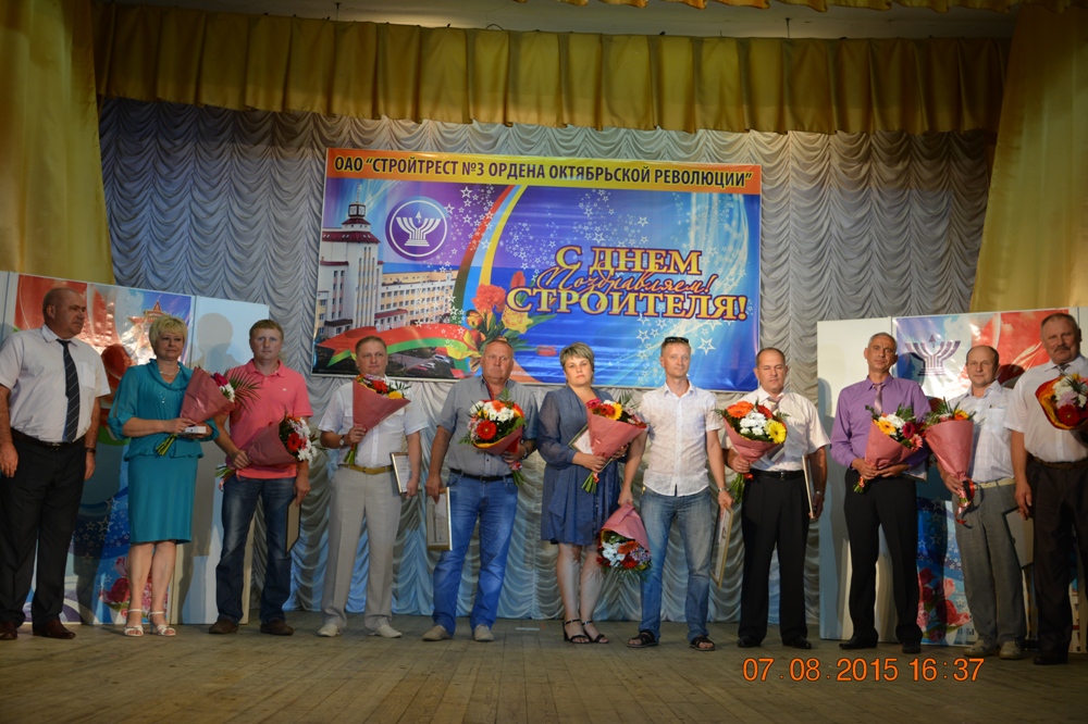 С профессиональным праздником тружеников поздравил генеральный директор ОАО «Стройтрест № 3 Ордена Октябрьской революции» Сергей Ермалинский. В своём приветственном слове он сказал: «Мы собрались вместе, чтобы в очередной раз прочувствовать, насколько значимым и почётным является труд строителя. Кем бы вы ни работали - каменщиками или плотниками-бетонщиками, отделочниками или дорожниками, проектировщиками - вы вносите свой вклад, создаёте основу благополучия нашего большого коллектива. Всем вам, кто строит и преображает наш Солигорский край, Минщину, кто далеко от родного дома трудится на стройплощадке Островецкой БелАЭС, - я выражаю слова благодарности за профессионализм, за верность профессии и стройтресту № 3… Прошедшие 2014 год и первое полугодие 2015 года для филиалов предприятия и его тружеников были напряжёнными и достаточно сложными. В этих условиях, проверяющих нас на прочность, именно ваши опыт, мастерство, умение эффективно организоваться вселяют твердую уверенность в преодолении всех трудностей, в дальнейшем надежном развитии не только нашего коллектива, но и отрасли, в обеспечении условий для комфортной и благоустроенной жизни наших граждан. Ведь именно вы, уважаемые строители, в самые непростые времена оживляли экономику, поднимали уровень жизнь общества. Я убежден, что так будет и впредь! И мы вместе впишем еще немало славных страниц в историю предприятия, Солигорщины и Минской области. В этом нам помогут наш богатый опыт, славные традиции и мощный потенциал».