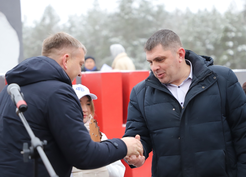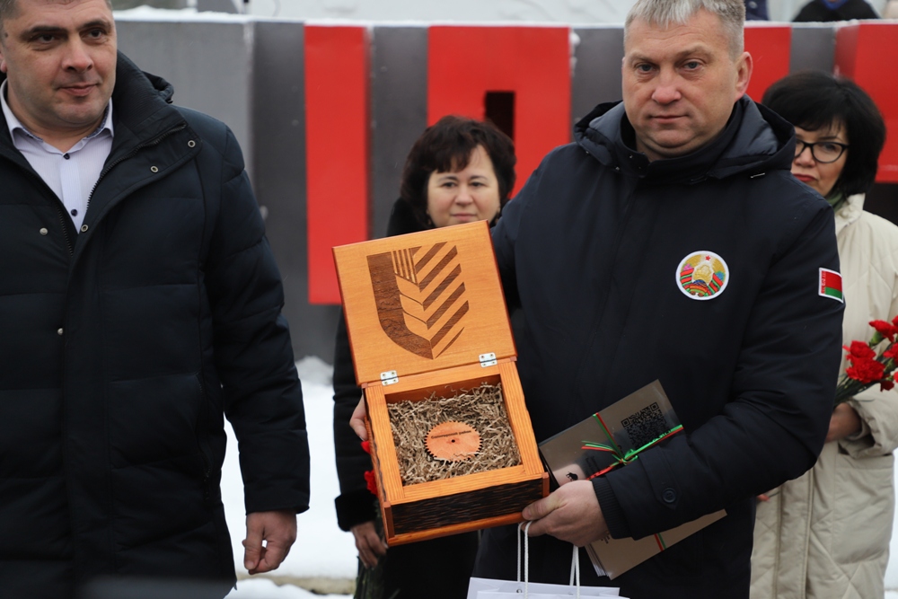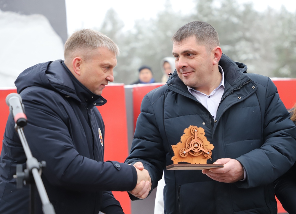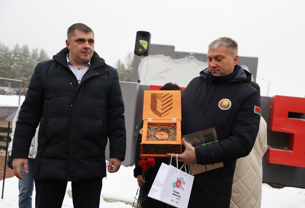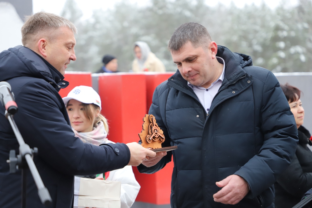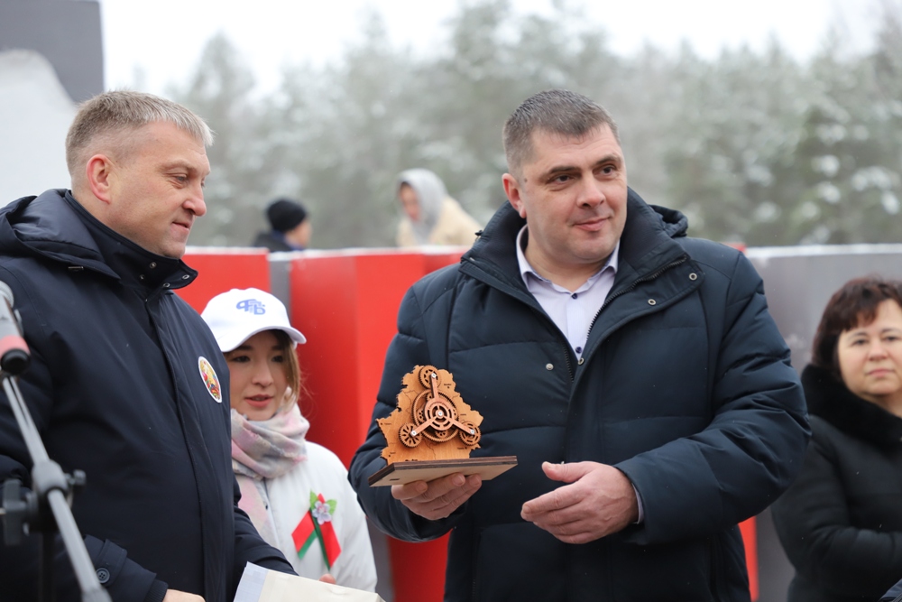 Председатель Солигорского райисполкома Андрей Жайлович символическую шестеренку от Солигорщины передал председателю РОО «Патриоты Беларуси» Николаю Зарубицкому.