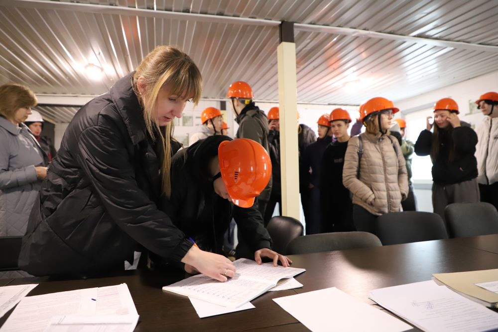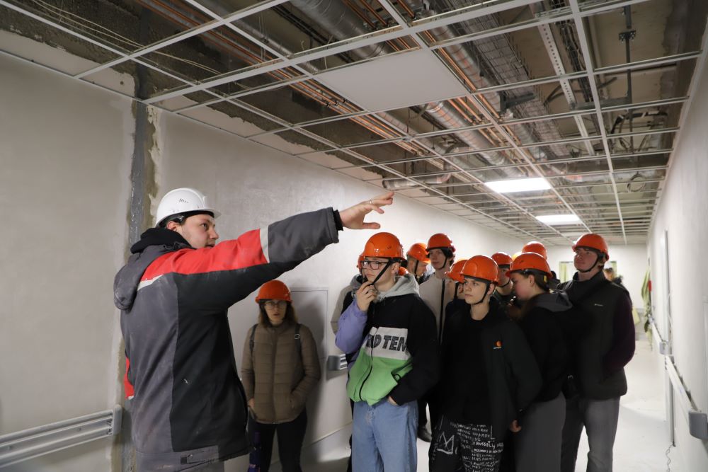 Экскурсию по этажам, где выполняются или уже завершены отделочные работы для учащихся провели мастер СУ-137 Максим Крутько и заместитель генерального директора - главный инженер стройтреста № 3 Павел Королько. Но прежде представители СУ-95 стройтреста № 3 - генеральной подрядной на объекте организации - провели с учащимися и сопровождающими их лицами инструктаж по охране труда, выдали каски и показали как правильно их носить на стройке.