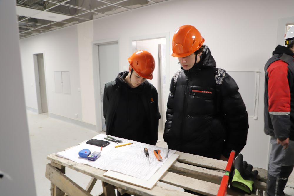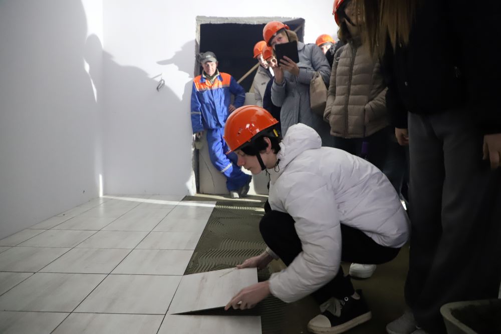 В одном из помещений хирургического корпуса бригада облицовщиков-плиточников СУ-137 позволила ребятам лично поучаствовать в процессе укладки напольной плитки. Студентам также показали устройство направляющих при возведении перегородок из гипсокартона, устройство зашивки потолка из гипсокартона. Внимание учащиеся обратили на стены, которые были оштукатурены по технологии "мокрый шёлк" - многосоставными декоративными смесями.