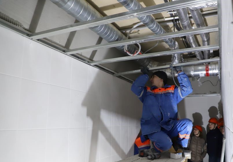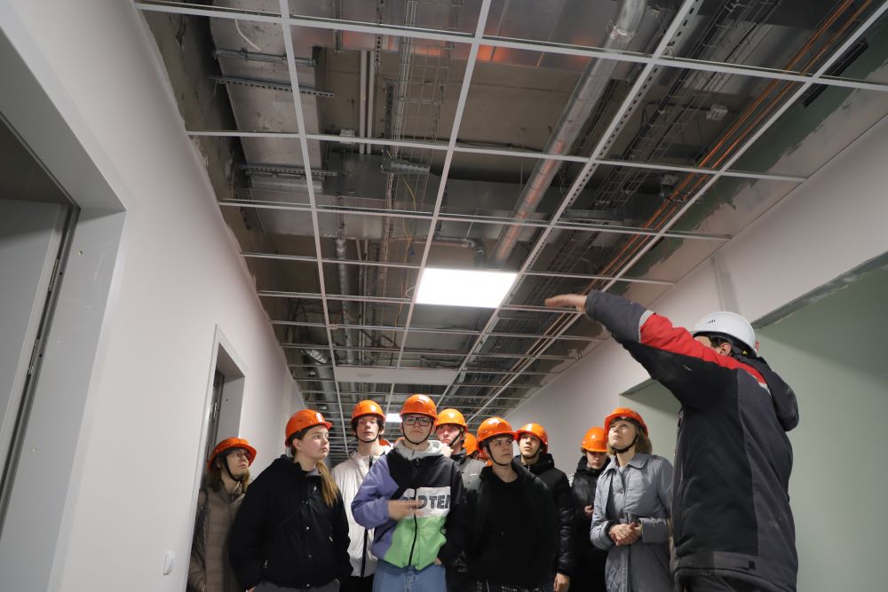Также учащиеся увидели за делом плотников СУ-137, которые занимались устройством подвесной потолочной системы "Армстронг" и узнали, как много разных коммуникаций - локально-вычислительных, медицинских газов, вентиляционных и других - прокладывается строителями под потолком. А еще студенты побывали в одной из реанимационных палат, практически готовой к подключению систем жизнеобеспечения.