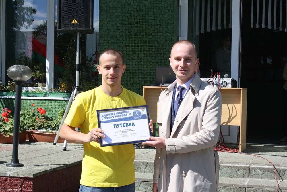 - Мне вдвойне приятно дать стать новому трудовому в вашем колледже, - обратился к студентам первый секретарь обкома БРСМ Александр Дичковский, вручая путевку педагогическому отряду "Виктория". - Студотряды - одно из главных направлений работы Белорусского республиканского союза молодежи. Уверен, что в этом трудовом семестре каждый из вас сможет еще больше раскрыть свои профессиональные качества, подкрепить свои теоретические знания на практике, развить свои лидерские качества и главное - поработать в команде. А это уже ответственность не только за себя, но и за свою команду - студотряд и свой колледж. Пусть у вас все получится. В добрый путь!