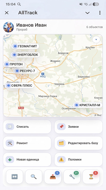 Одно из самых востребованных — Alltrack. Это приложение, работающее через Telegram, которое помогает вести учет и контроль за перемещением и статусом инструментов, средств малой механизации, бытовых помещений и других материальных ценностей. В строительстве это особенно важно: работники перемещаются между объектами с инструментом и оборудование, передают его между собой, и часто эти перемещения никак не фиксируются.