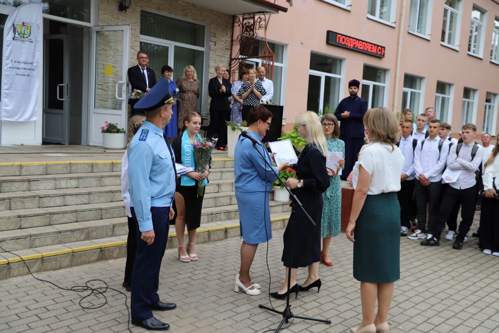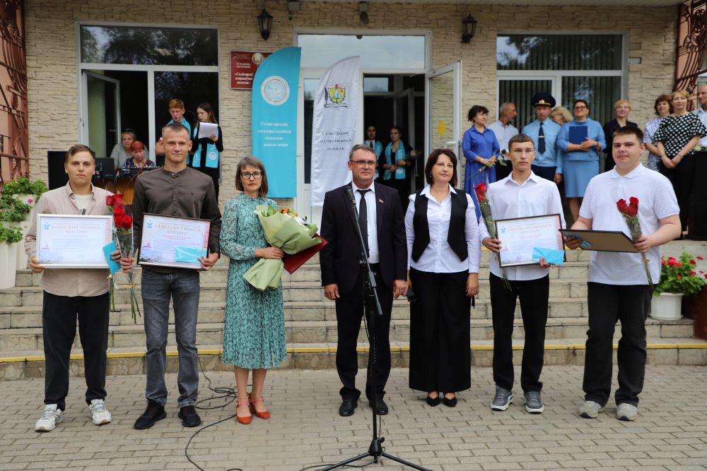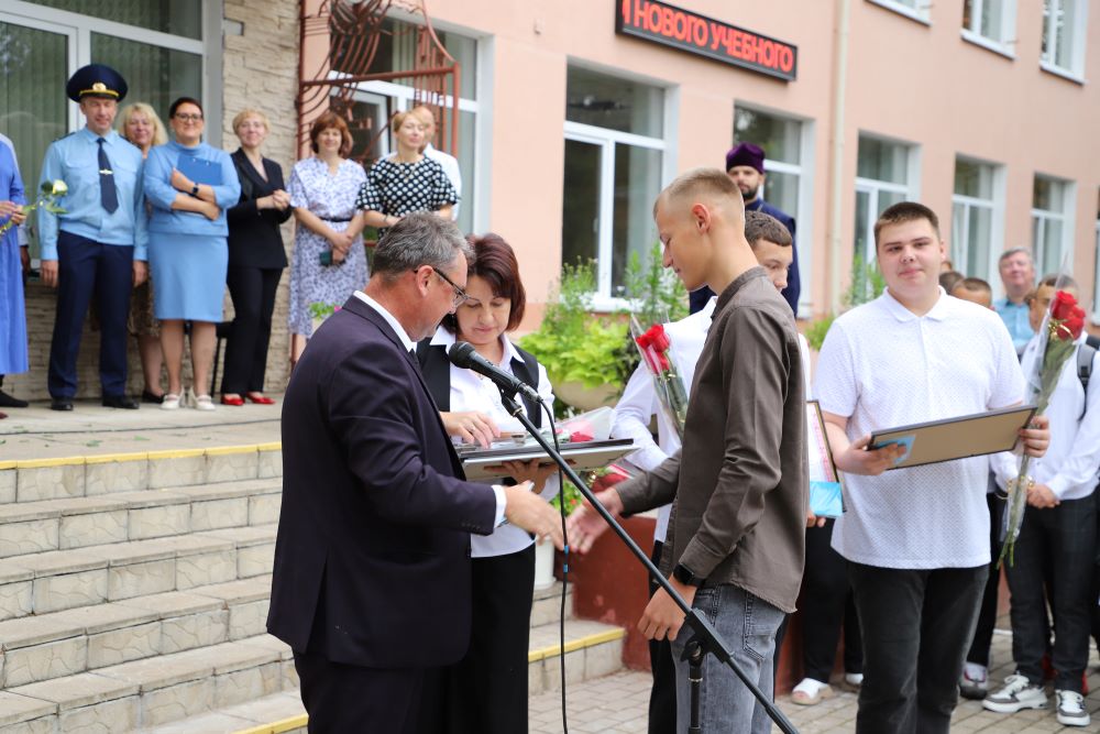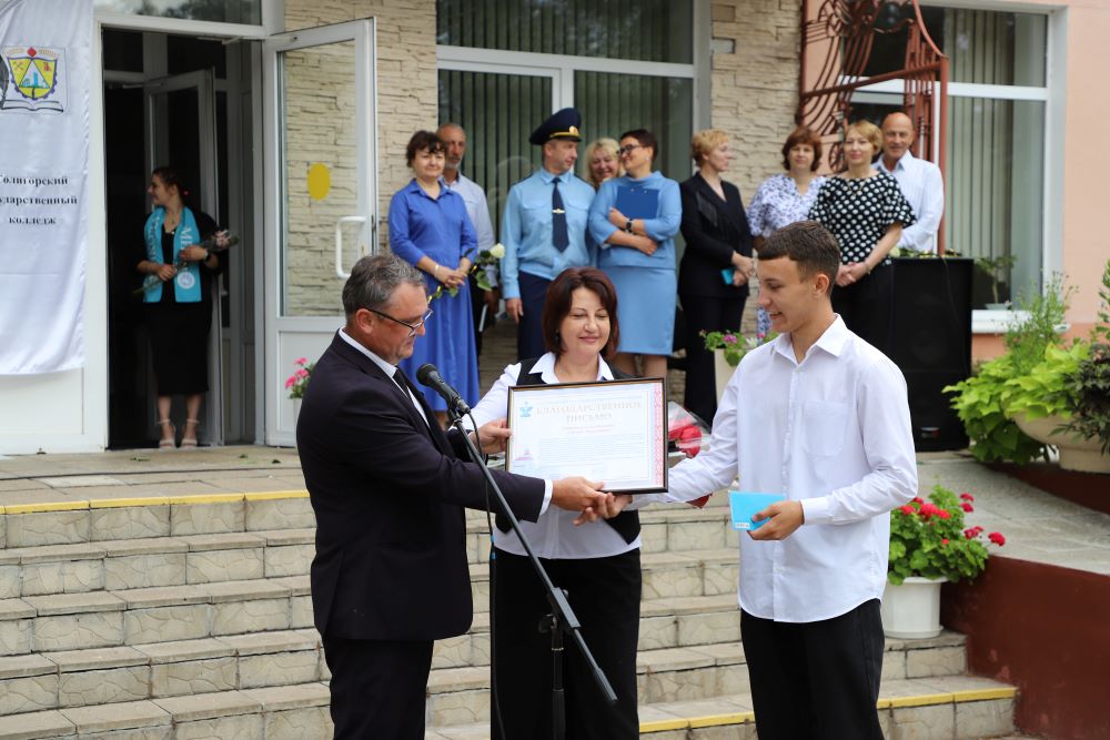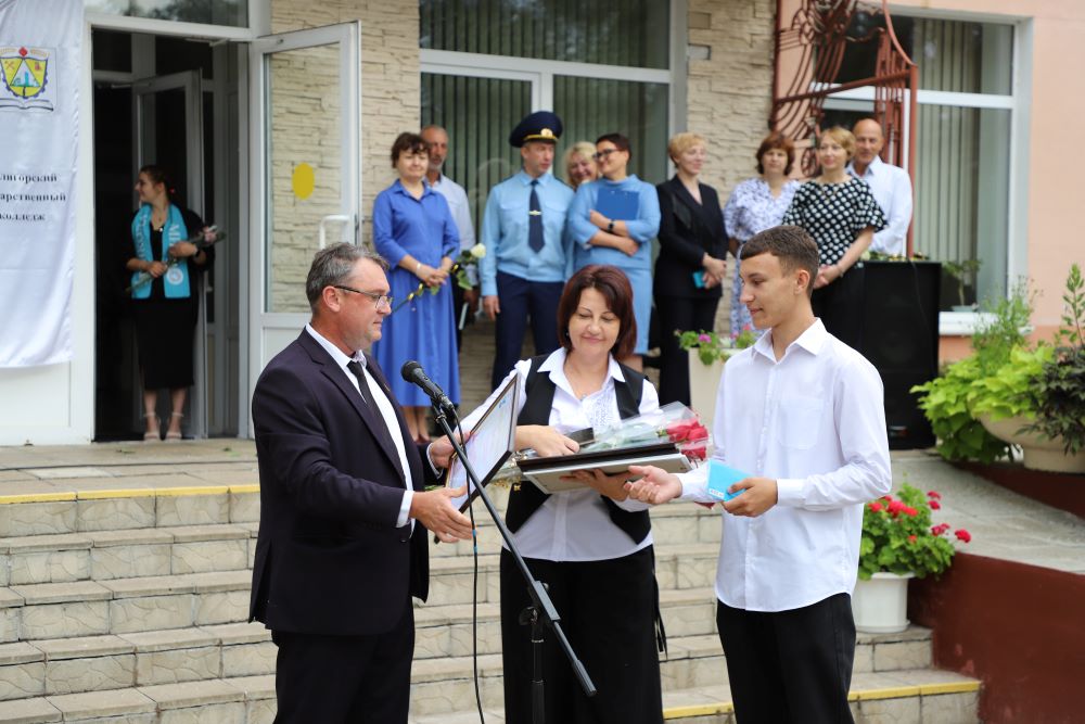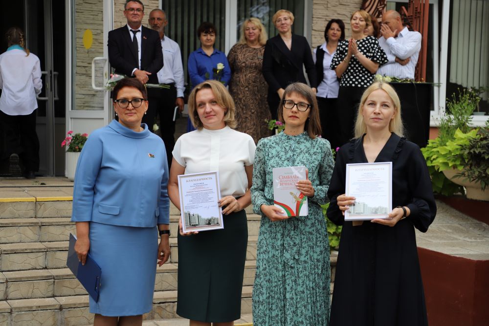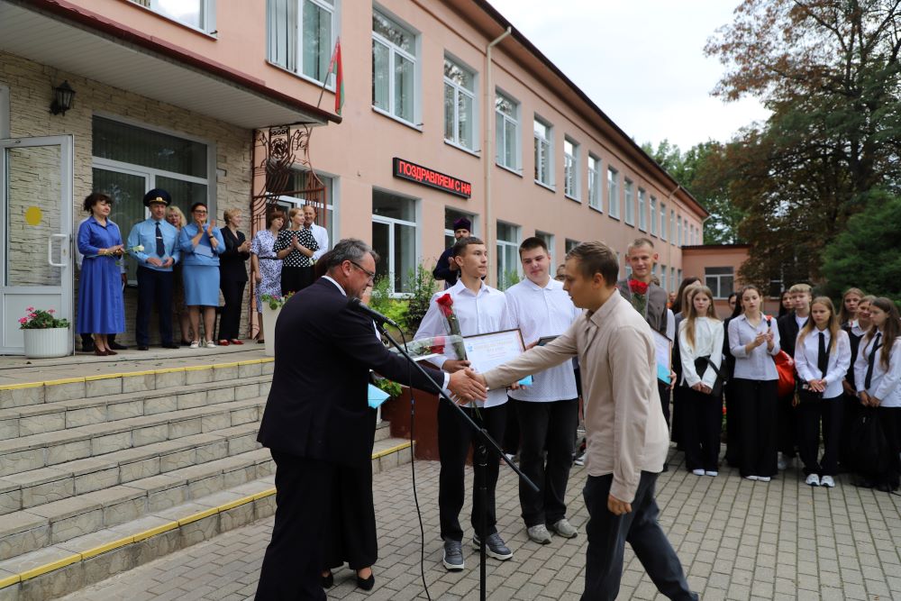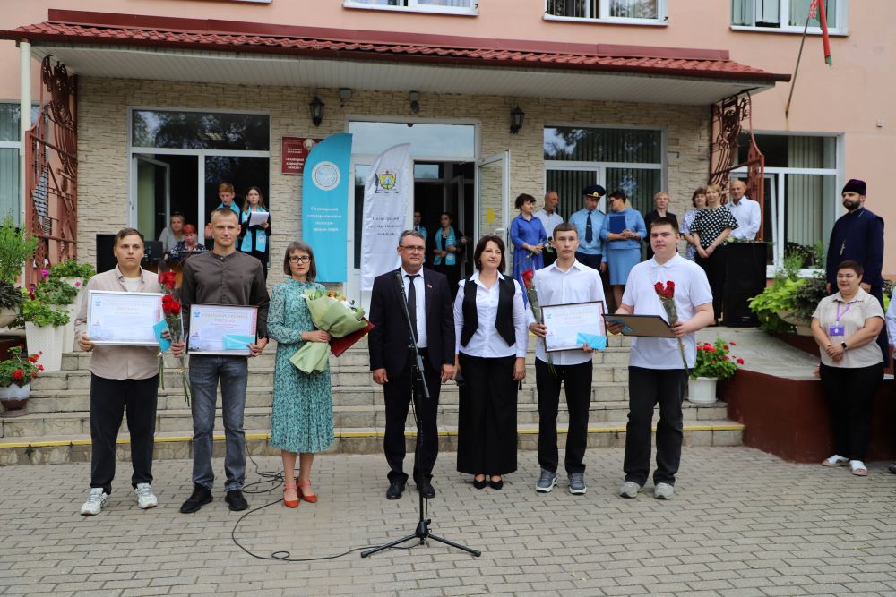 В ходе торжественной линейки Юрий Олехнович и Ольга Ганчар отметили труд студентов групп м-22п, 422п политехнического отделения в составе стройотряда, вручили им подарочные сертификаты, а также Благодарственные письма их родителям. Это Владислав Тонко, Стефан Писарик, Андрей Котяк и Егор Куликовский.