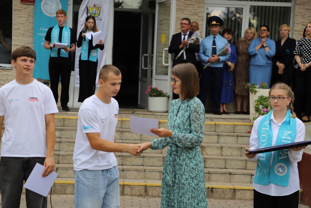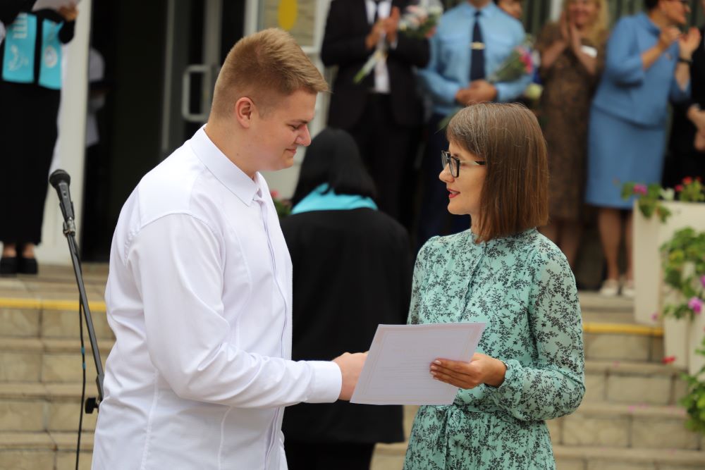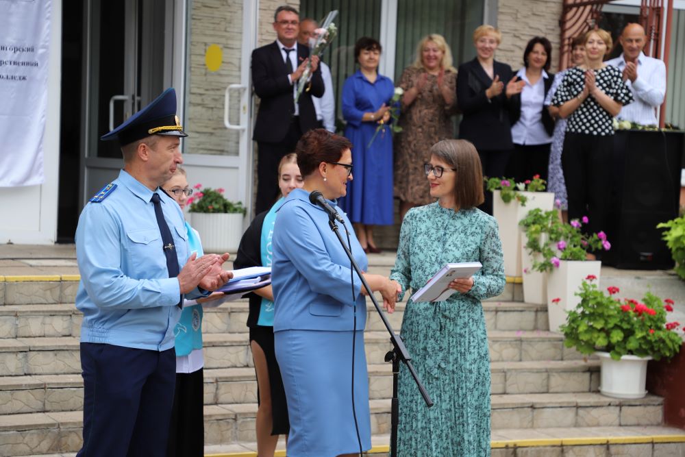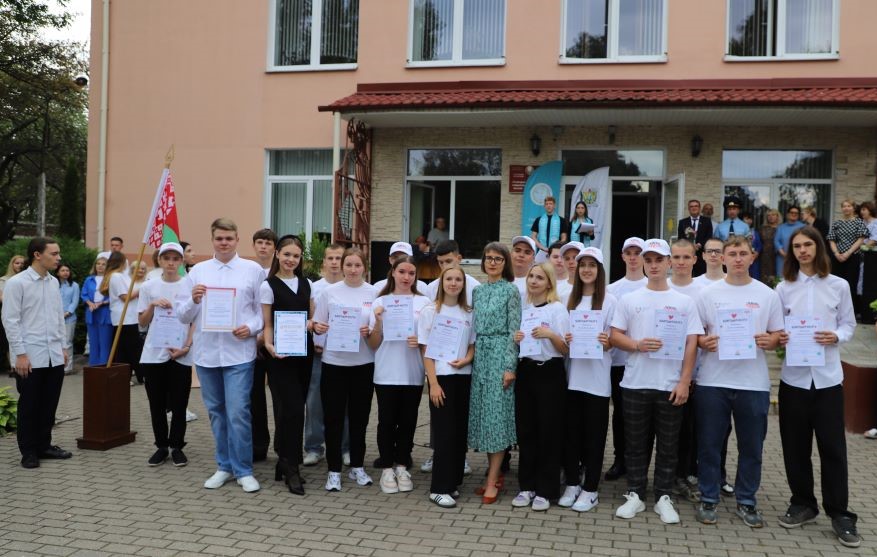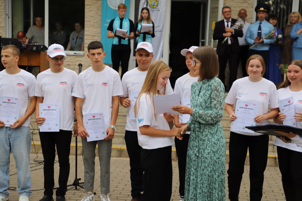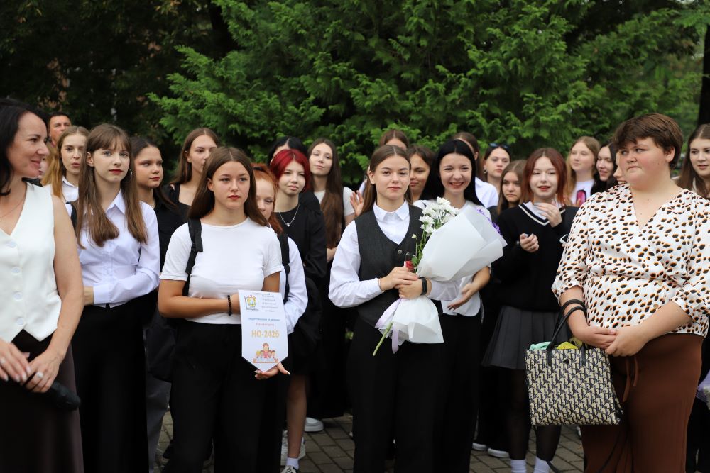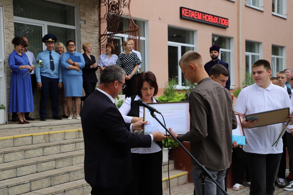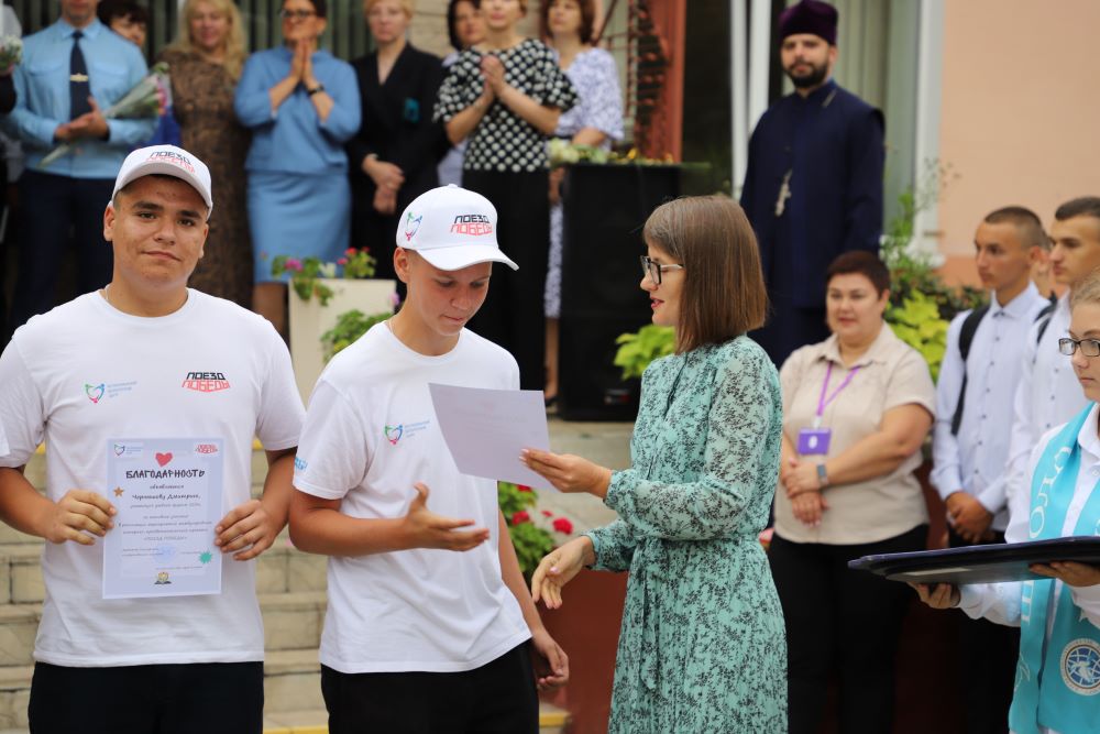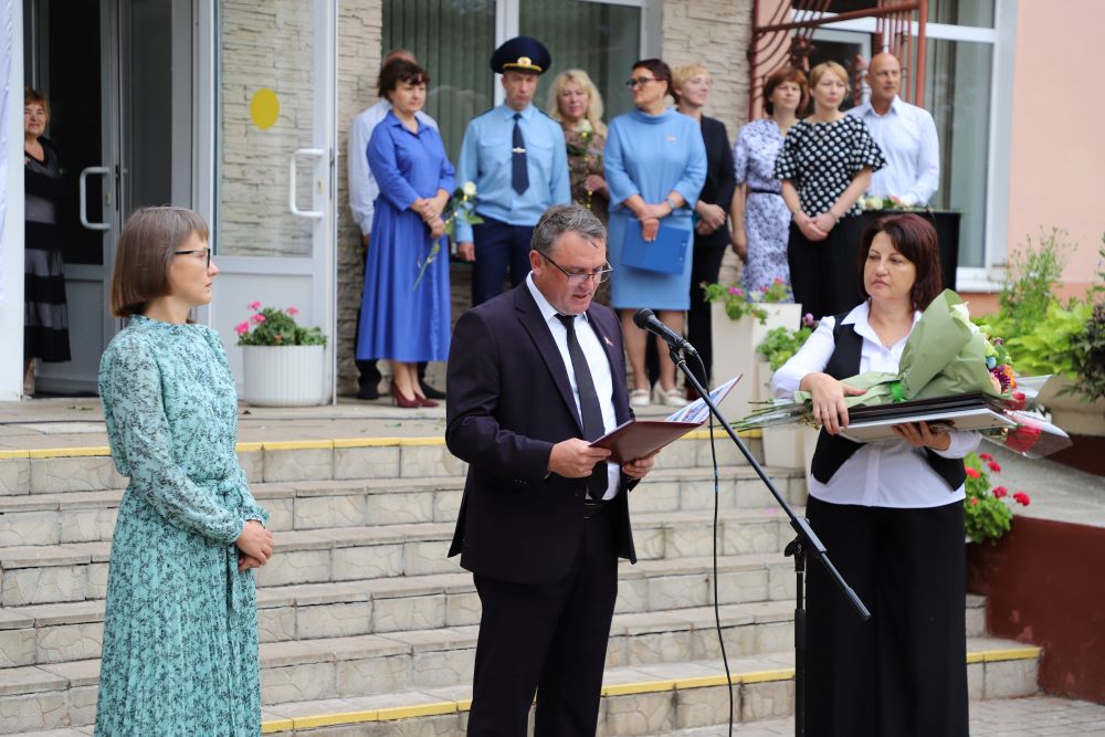 В ходе торжественной линейки Юрий Олехнович и Ольга Ганчар отметили труд студентов групп м-22п, 422п политехнического отделения в составе стройотряда, вручили им подарочные сертификаты, а также Благодарственные письма их родителям. Это Владислав Тонко, Стефан Писарик, Андрей Котяк и Егор Куликовский.